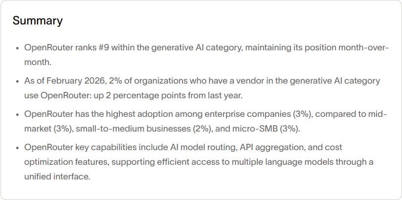 The truth:Despite its significant presence in the developer community, according to ramp, OpenRouter actually accounts for only about 2% of global AI spending.