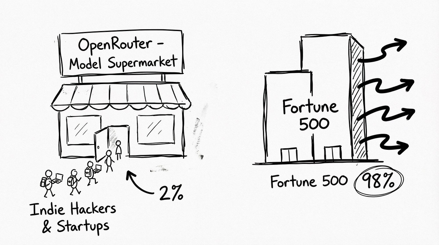 The real traffic drivers—the Fortune 500 companies and large SaaS vendors (such as Salesforce and Microsoft) that consume over 90% of the world’s tokens—will never call models through OpenRouter. Instead, they directly connect to the official native APIs of OpenAI and Anthropic or use Azure/AWS hosting.