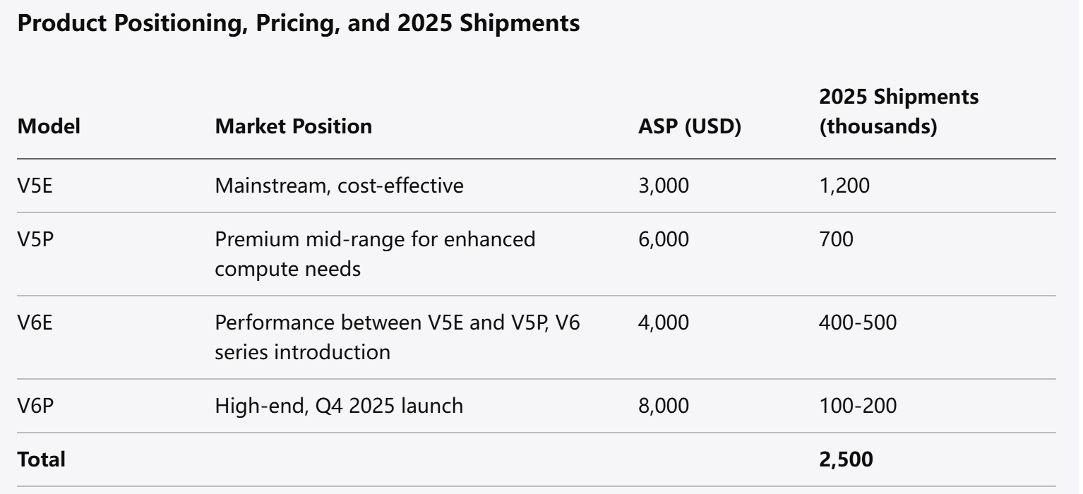 For the advanced V7 series, V7E shipments may approach 500,000 units as the series flagship targeting high-performance inference applications. V7P, if launched as scheduled in Q4, could reach up to 100,000 units, though potential delays due to development timelines, production ramp-up, or customer validation cycles could push the launch to 2027.