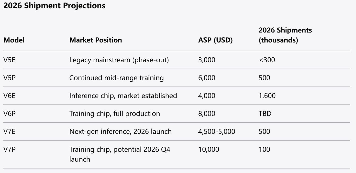 The 2026 shipment landscape will show clear generational transition patterns. V5E volumes will not exceed 300,000 units as performance lags market requirements, with deployment limited to legacy server upgrades primarily in Q1-Q2 before gradual phase-out. Total V5 series shipments (V5E and V5P combined) are projected at 800,000 units, with V5P maintaining around 500,000 units due to continued relevance for mid-scale data center training requirements.